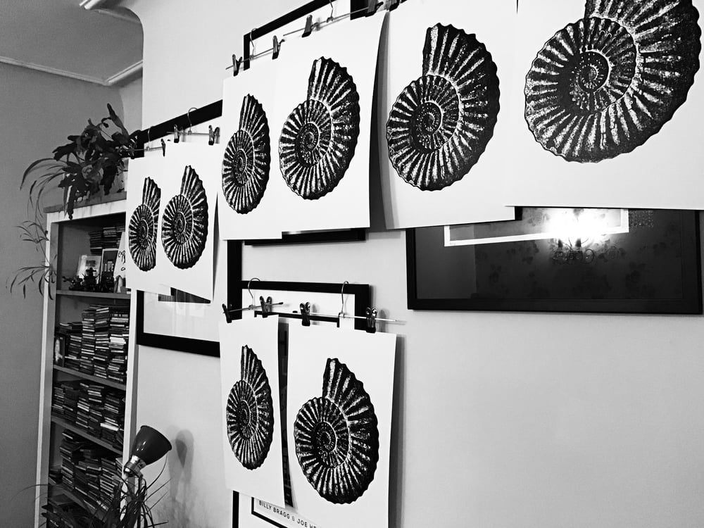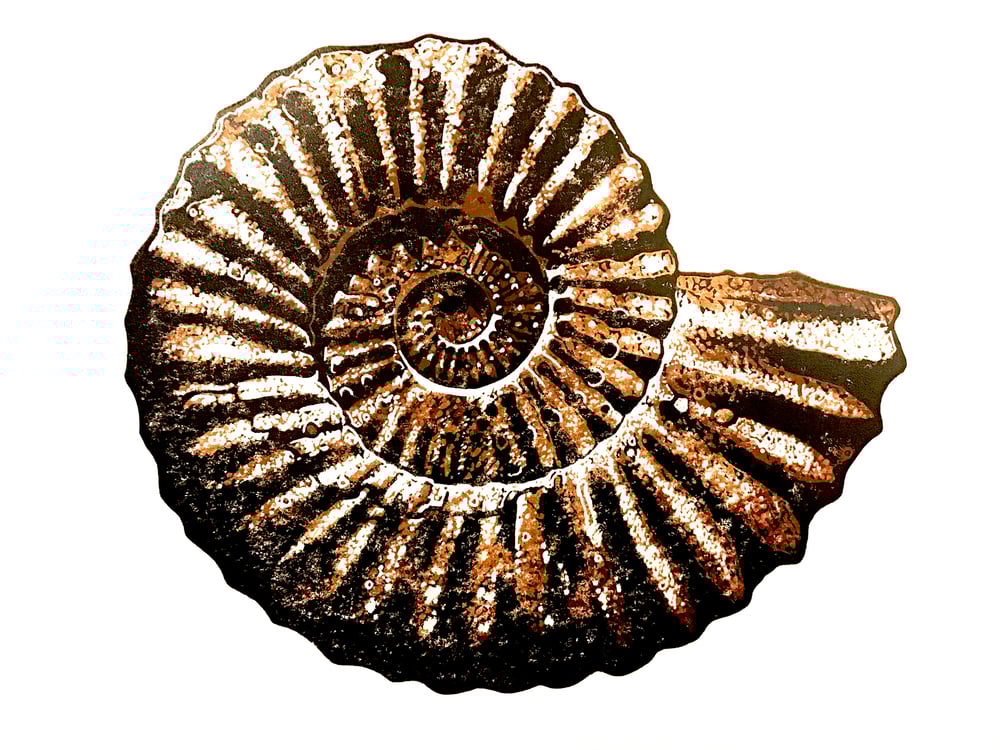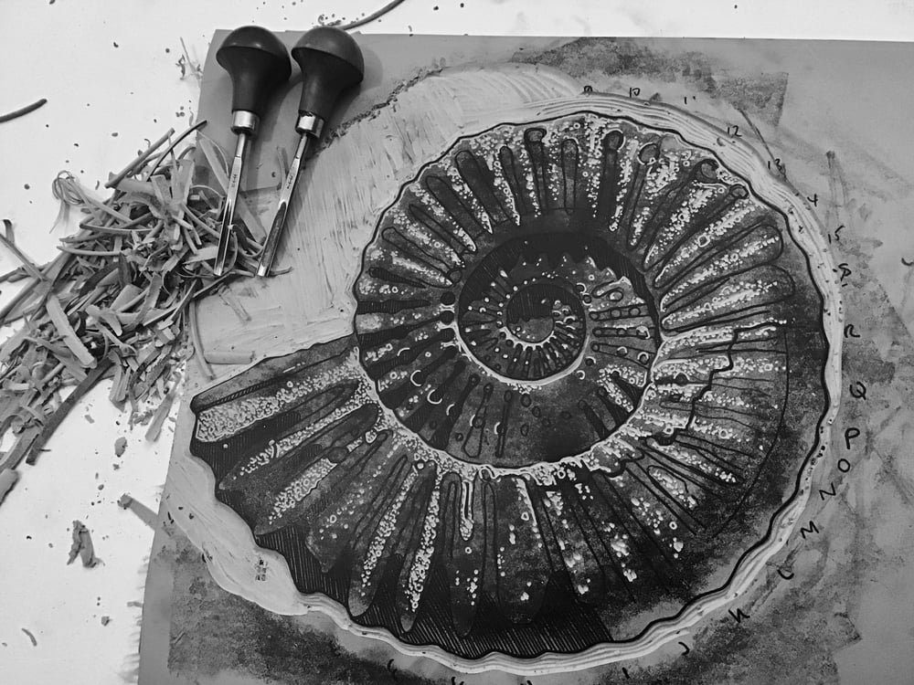 A hand carved, hand printed linocut of an ammonite fossil.