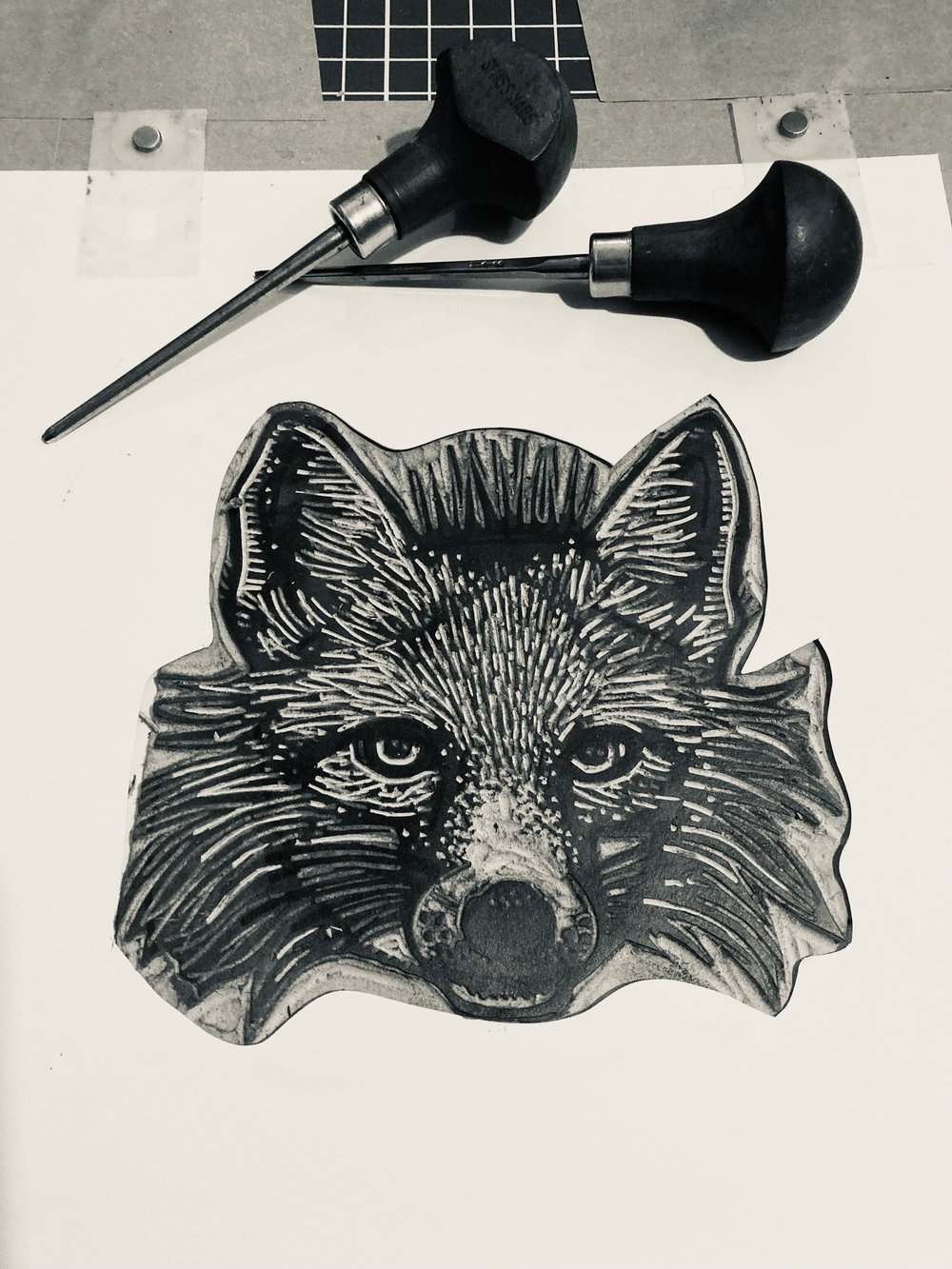 This is a hand carved, hand printed linocut print of a fox, printed using four colours of oil based ink in an edition of just 20 prints.