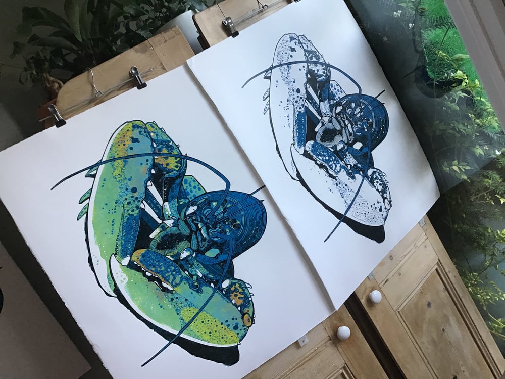 3 colour Lobster reduction linocut print
