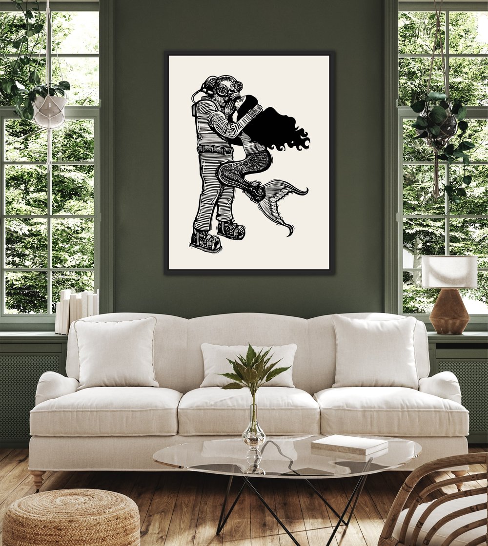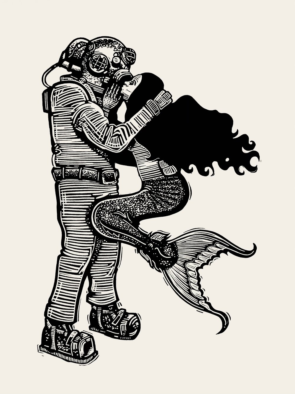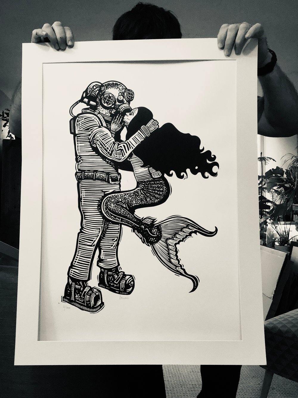 A hand carved, hand printed linocut of a vintage deep sea diver and a mermaid, updating one of my earliest linocut prints. This is an extra large version, carved completely from scratch which enabled me to add more detail than was possible on the earlier much smaller version.