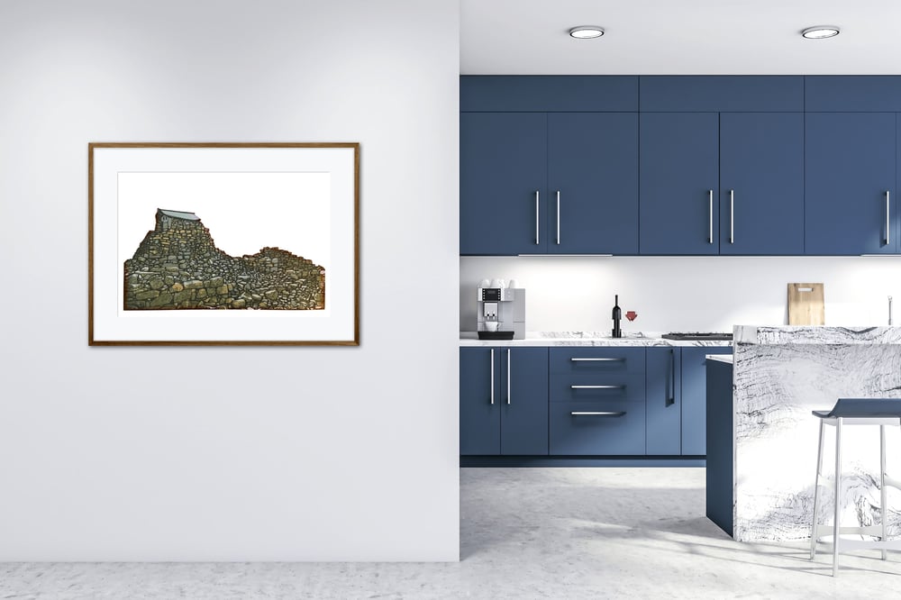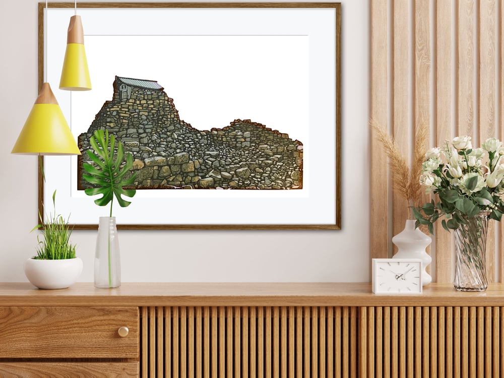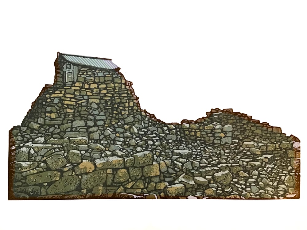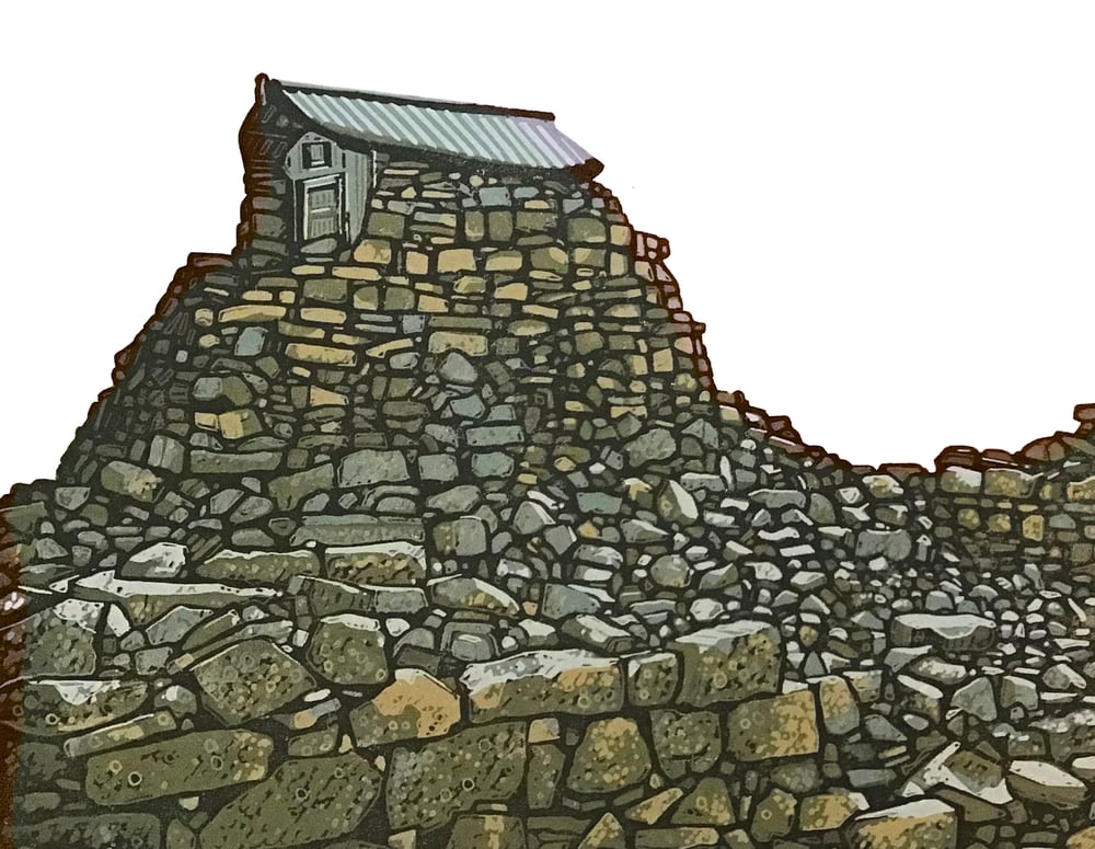 A hand carved, hand printed linocut of the storm shelter and part of the abandoned weather station on the summit of Ben Nevis