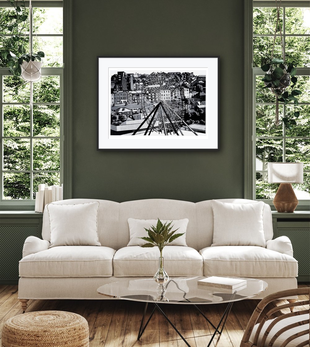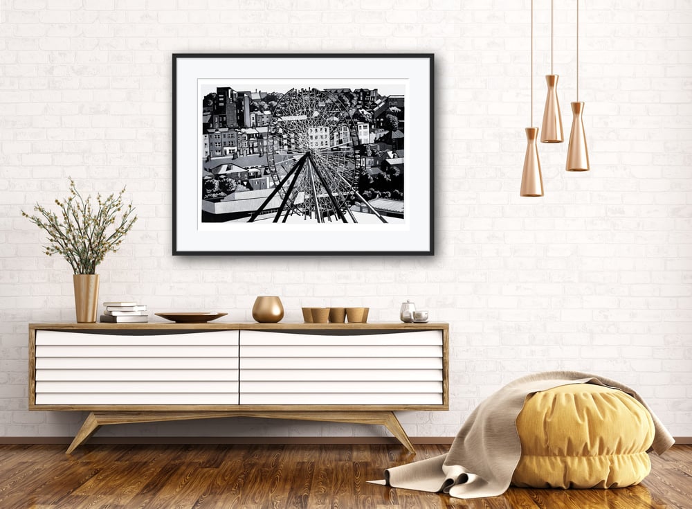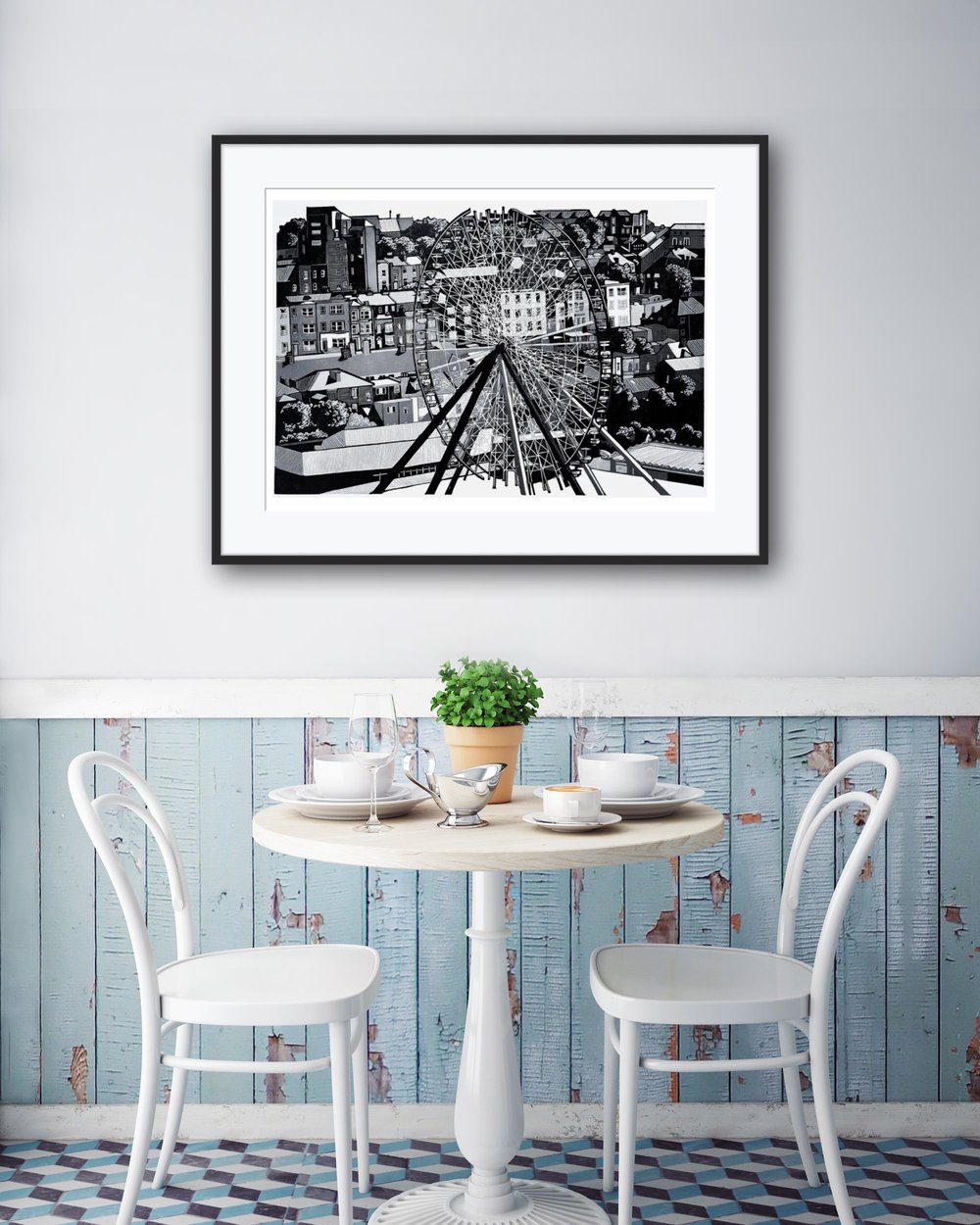 This is a hand carved, hand printed linocut print of the big wheel that used to grace the wonderful Dreamland park in Margate, England, just a few miles from my studio.