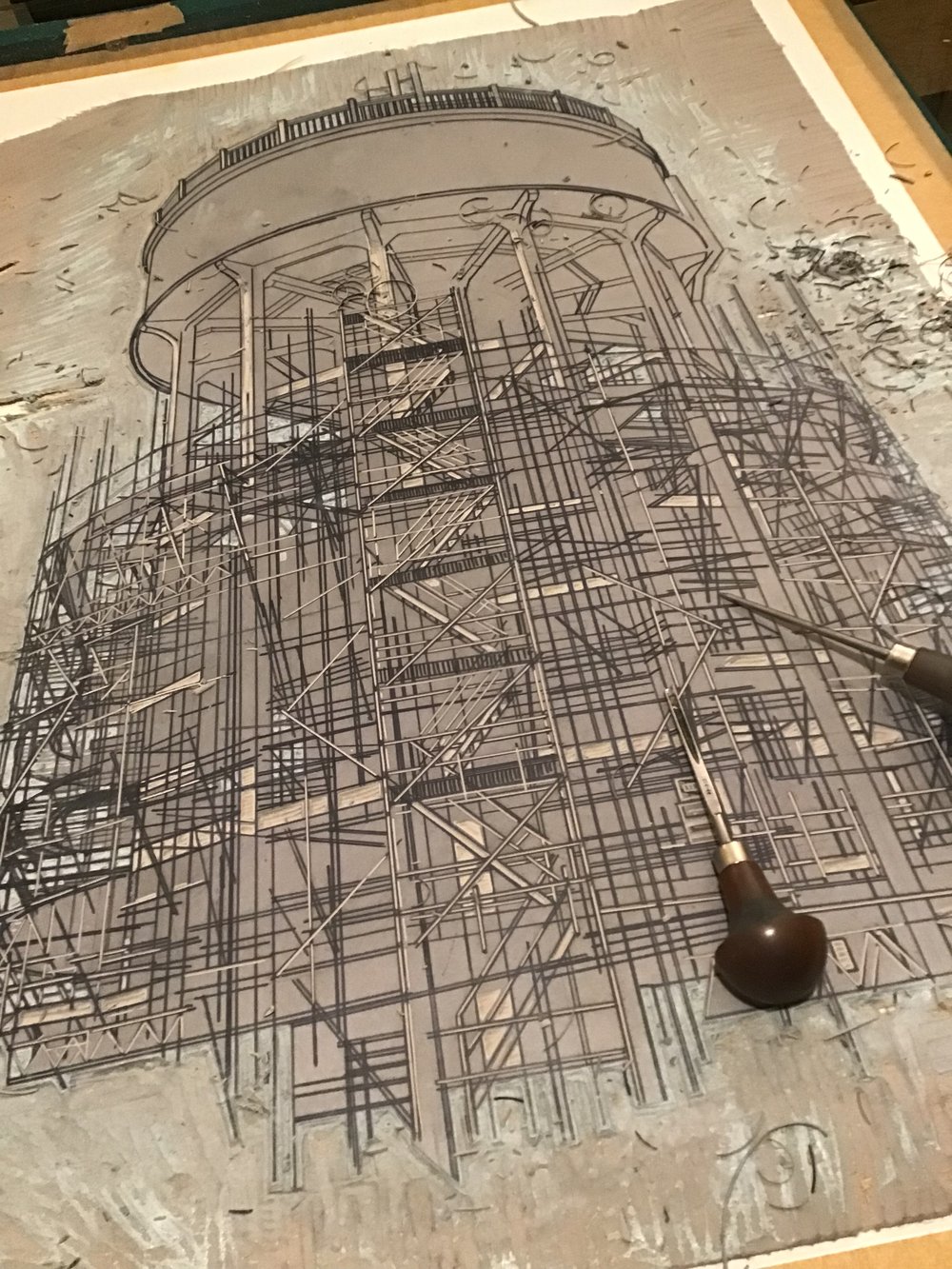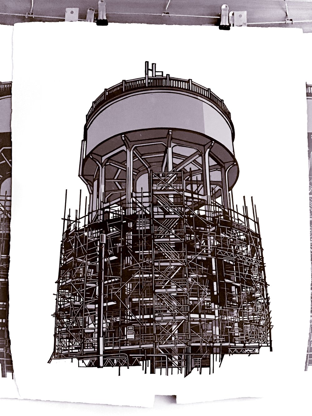 This is a hand carved, hand printed linocut print of the Rumfields water tower in Broadstairs, England, just a few miles from my studio and, until recently, covered in incredibly intricate scaffolding.